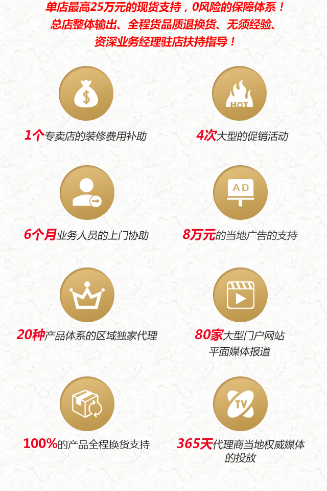 “金太郎”协助支持当地代理商市场扩展及广告支持,包括在当地电视、百度搜索、360搜索、报纸、墙体...等其他媒体广告投放,为你的市场推波助浪。